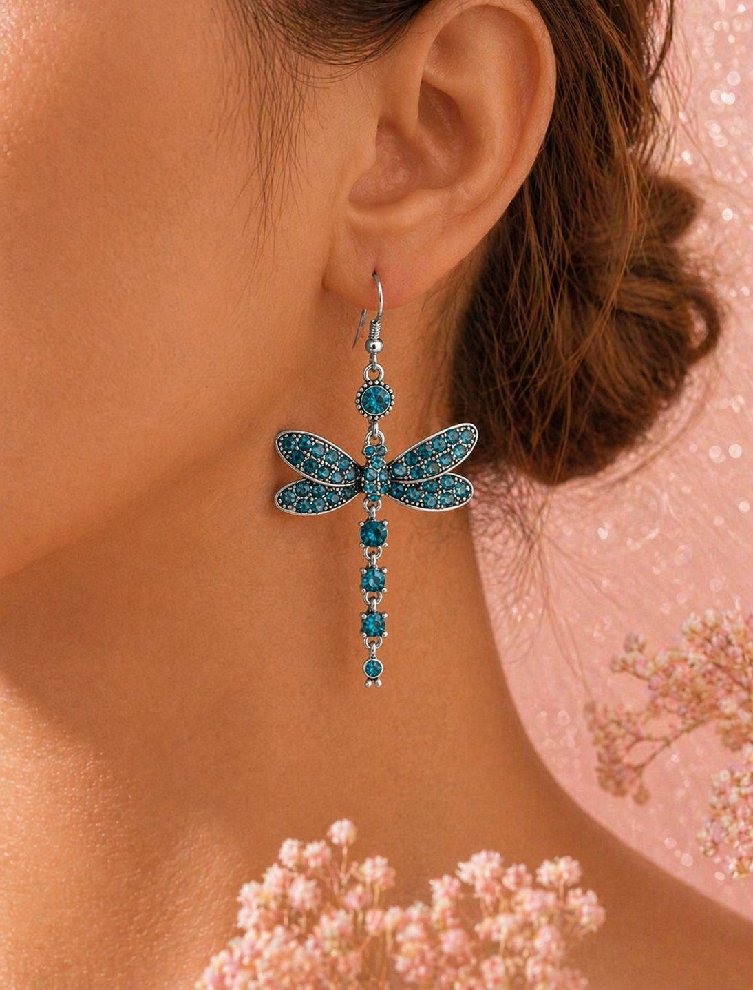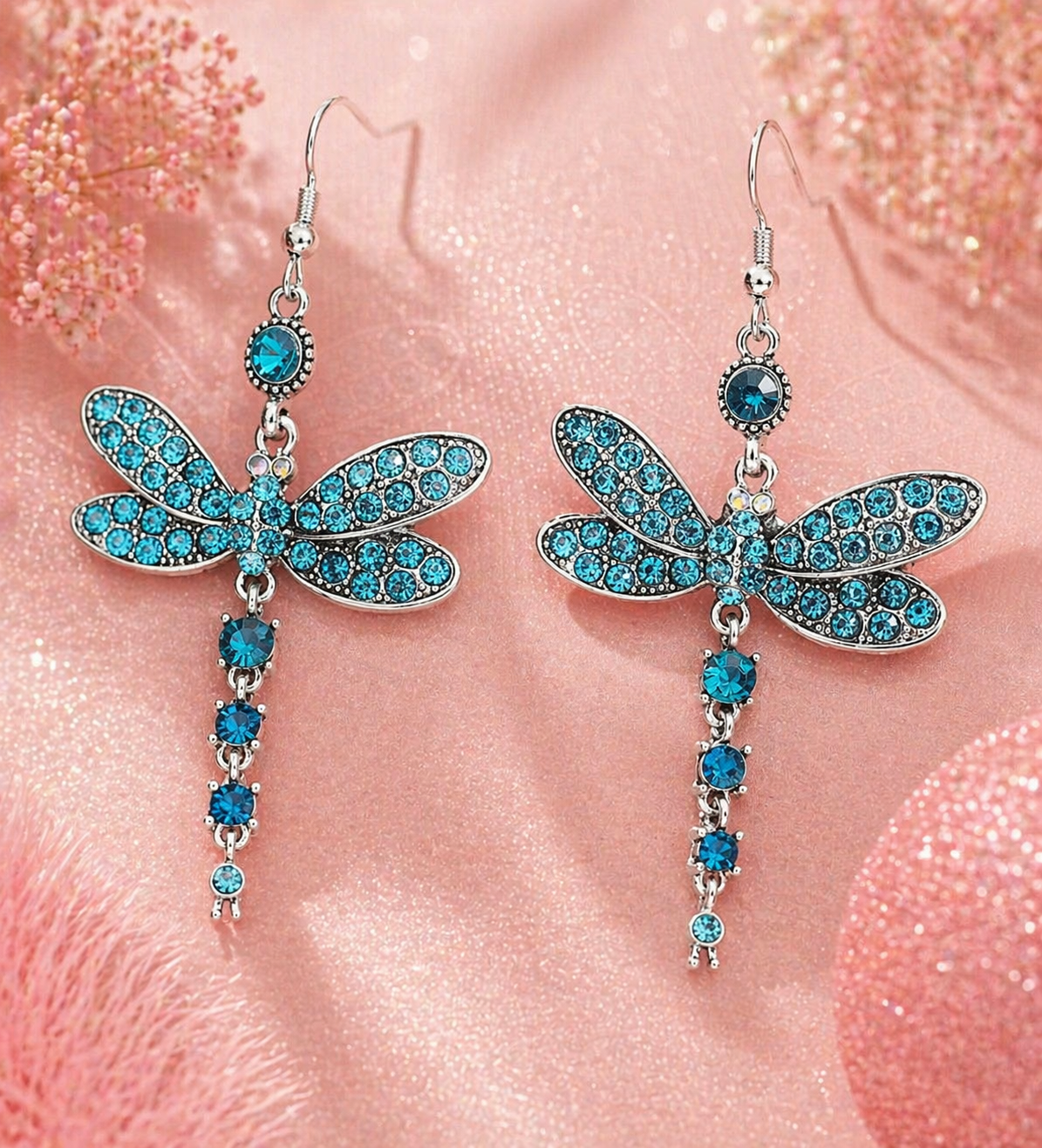 Eleganta örhängen formade som gnistrande trollsländor i djupa blå toner. De vackra stenarna fångar ljuset från varje vinkel och skapar en lyxig, iögonfallande effekt.