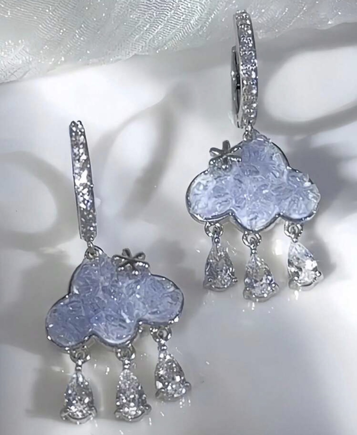 Molnörhängen i ljusblå kristall med gnistrande droppar som fångar varje ljusstråle. En elegant statementdetalj som förenar lekfull design med exklusiv känsla – perfekt för att lyfta både vardag och fest.