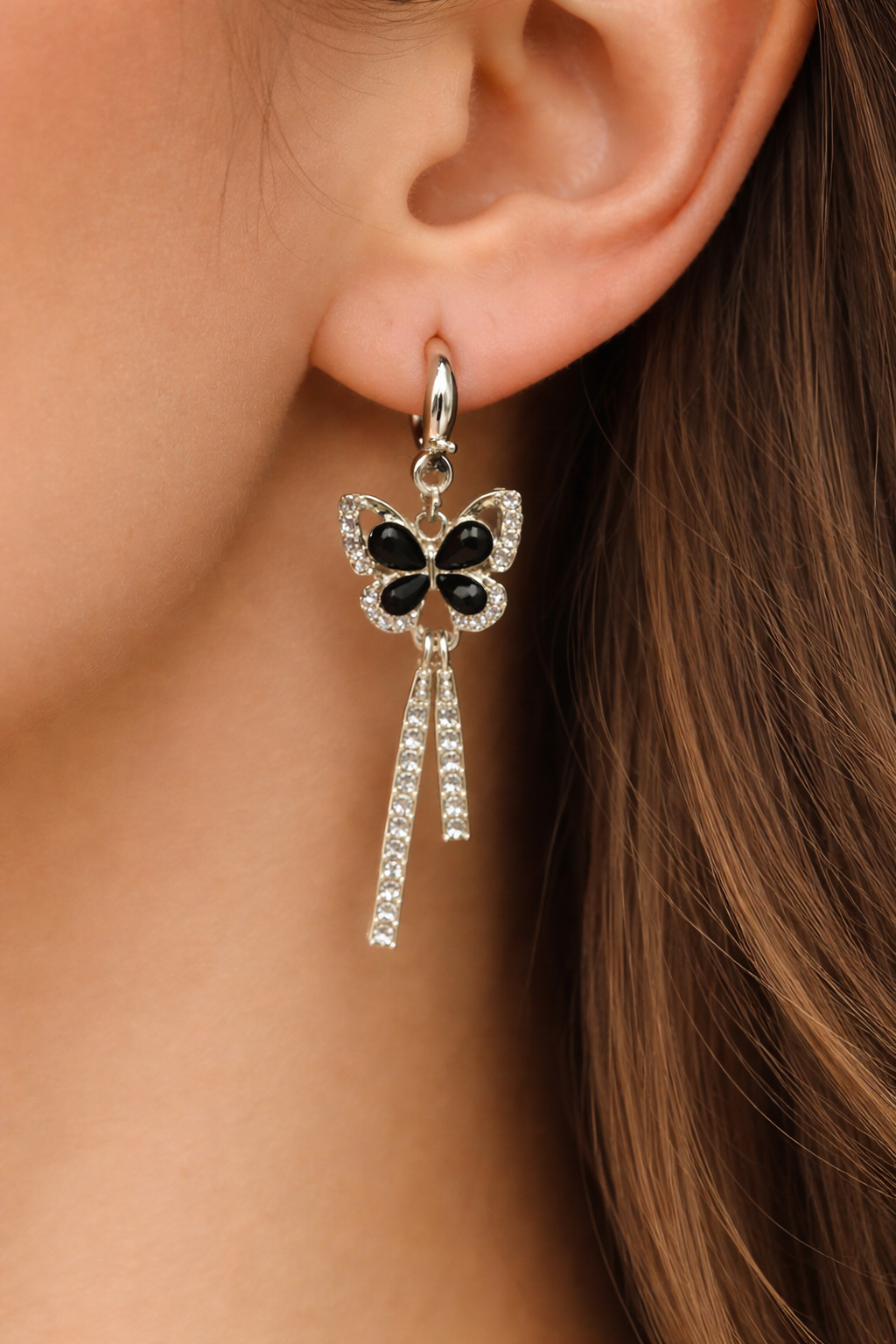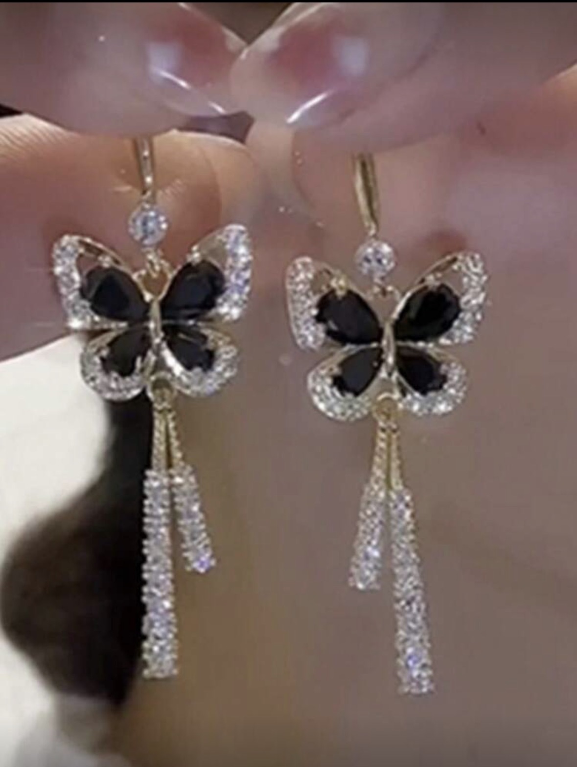 Fjärilsmotivet symboliserar förändring och skönhet, medan de hängande strassdetaljerna ger ett livfullt och lyxigt uttryck. Perfekta både till vardag och fest – dessa örhängen lyfter varje outfit.