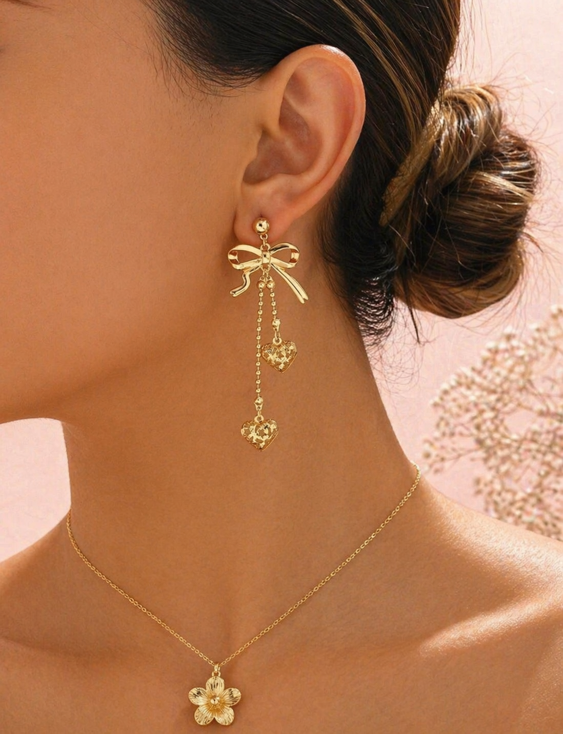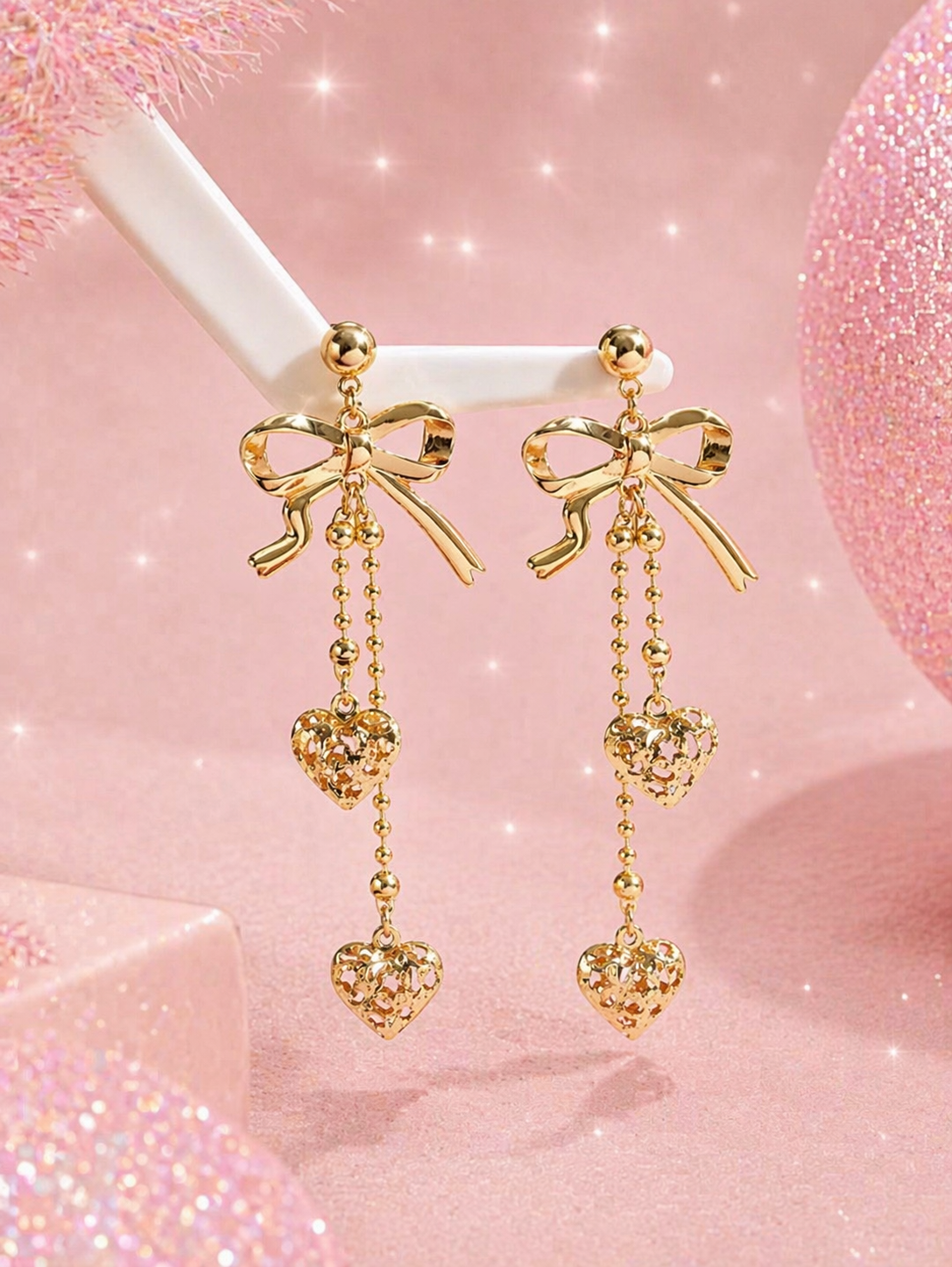 Eleganta örhängen i guldton med romantiska rosettdetaljer och hängande hjärtan som rör sig mjukt vid varje steg. Den gnistrande finishen och de fina kedjorna skapar en lyxig, feminin känsla som fångar ljuset på ett vackert sätt.