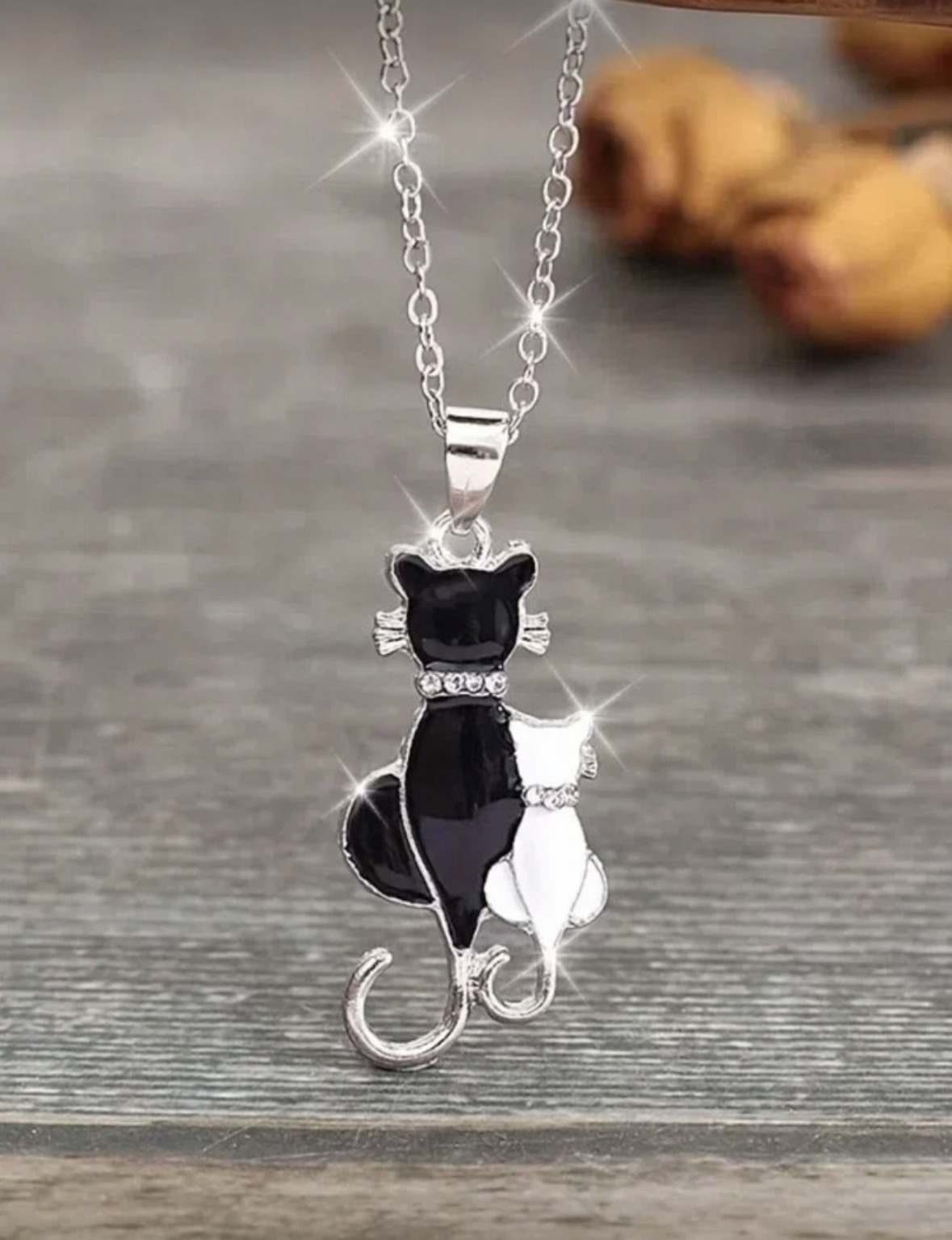 Halsband med två katter i svart och vitt. Ett unikt smycke för kattälskare som vill bära något personligt.