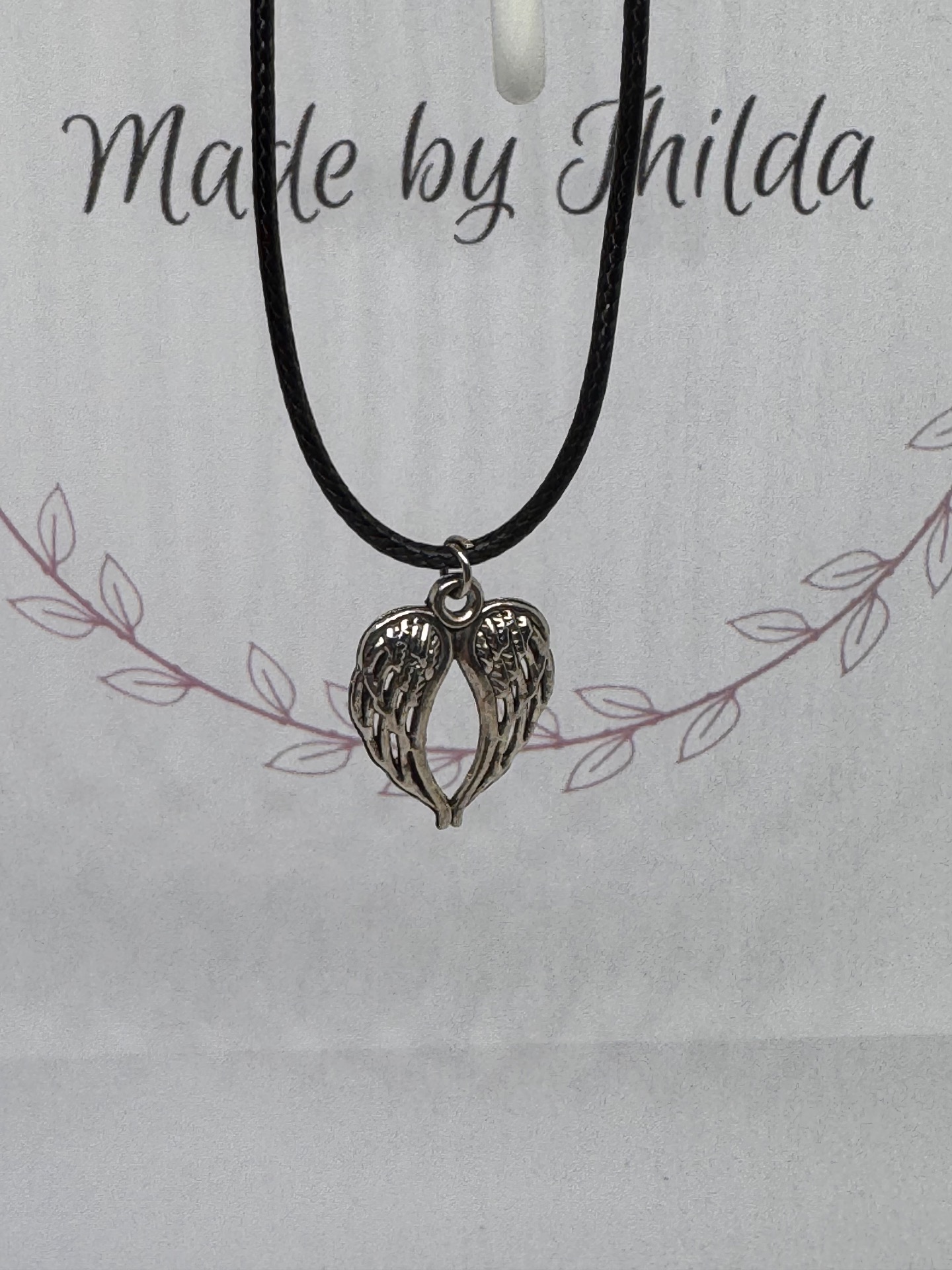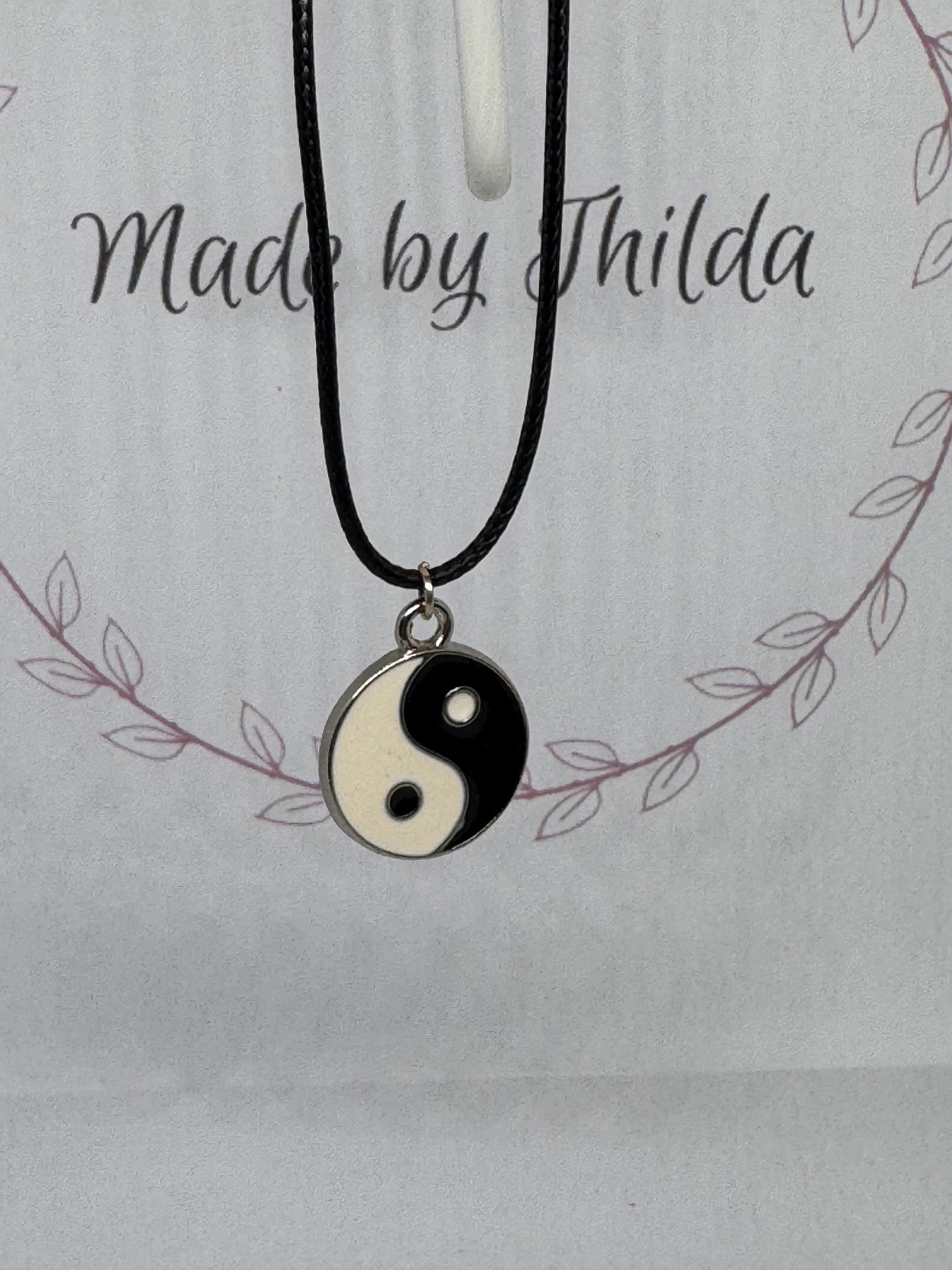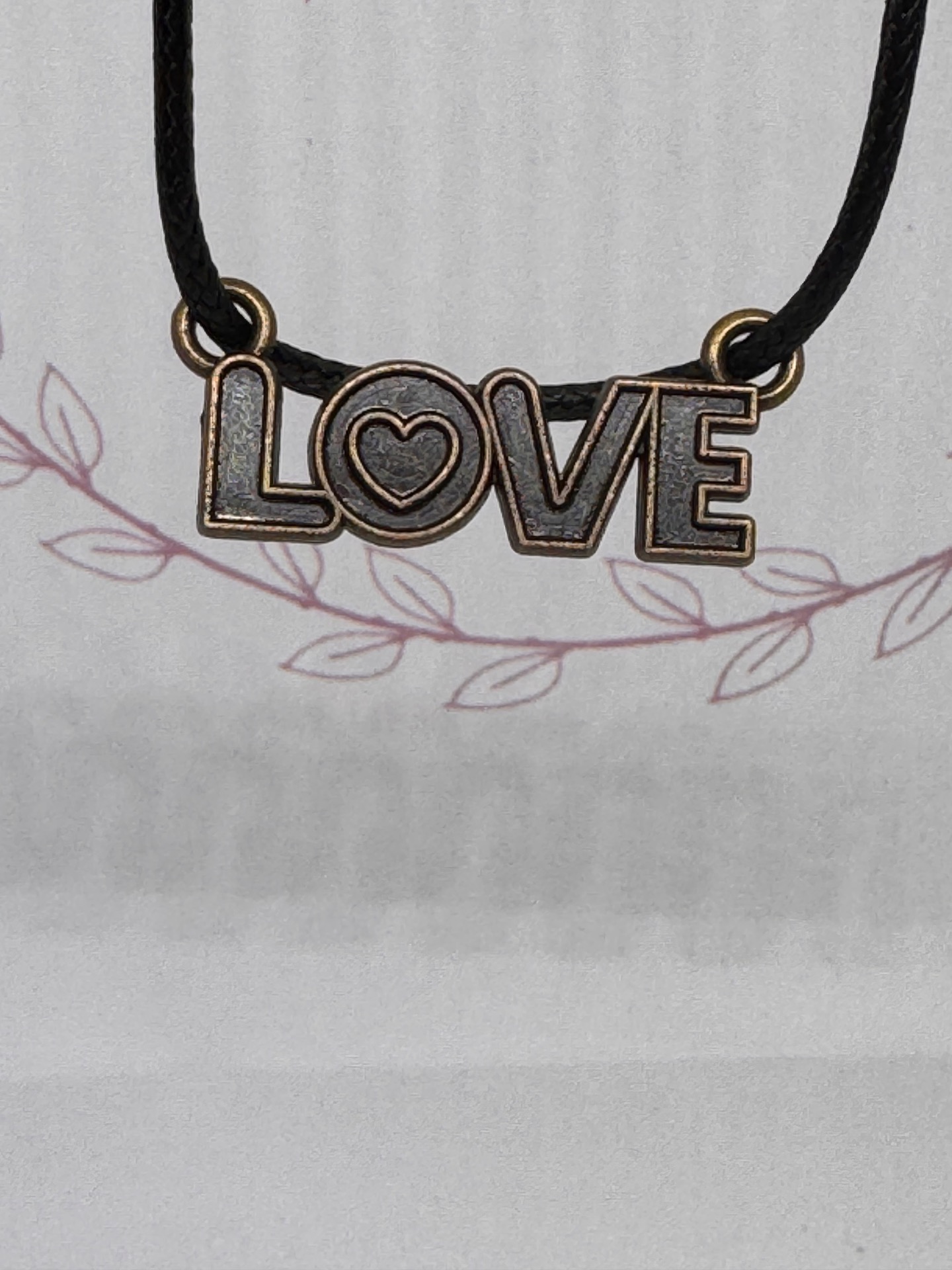 Svart rephalsband med olika berlocker, längd 44cm + 5cm kedja.