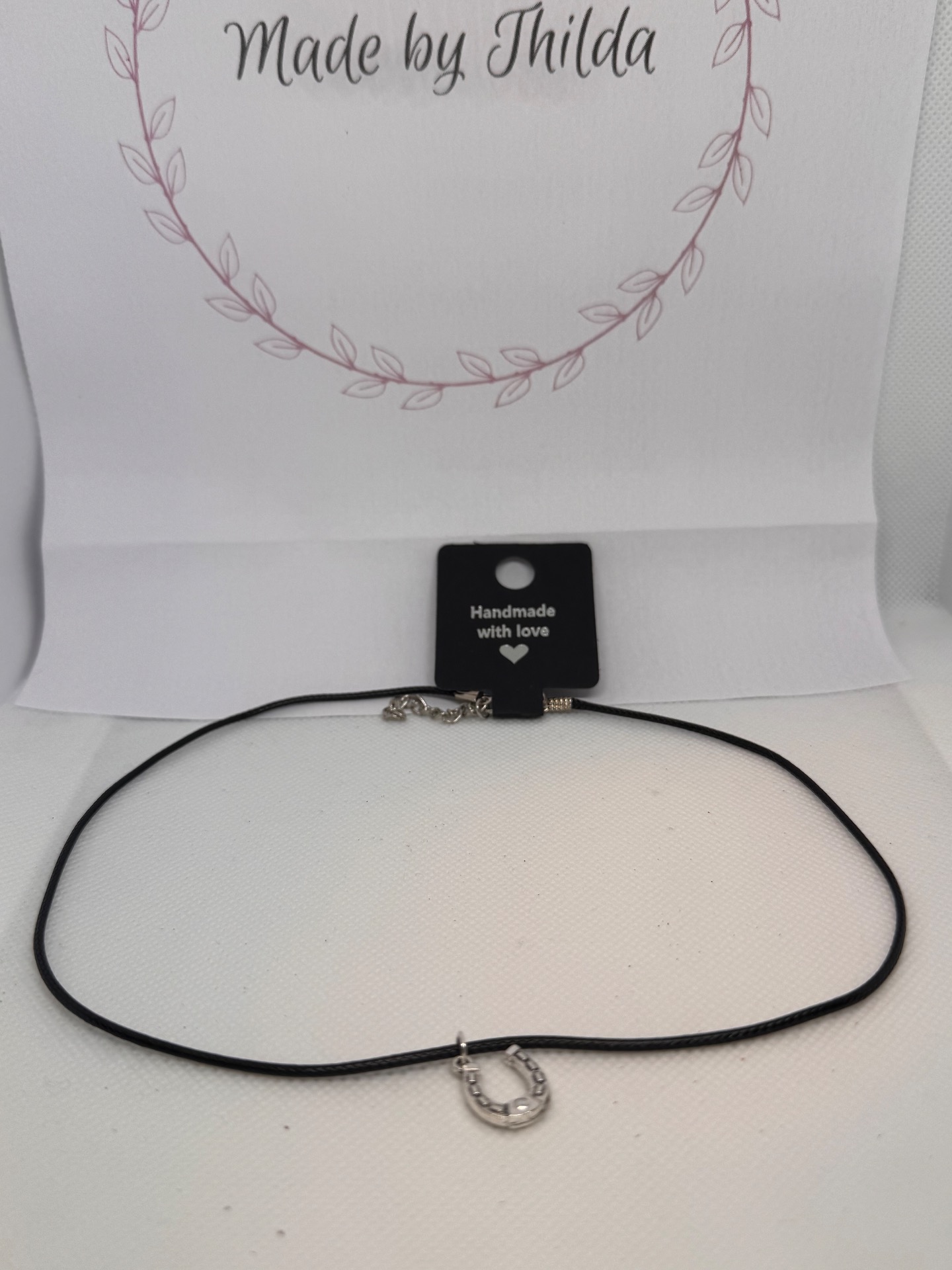 Svart flätad halsband med hästsko. Går att justera längd på det.