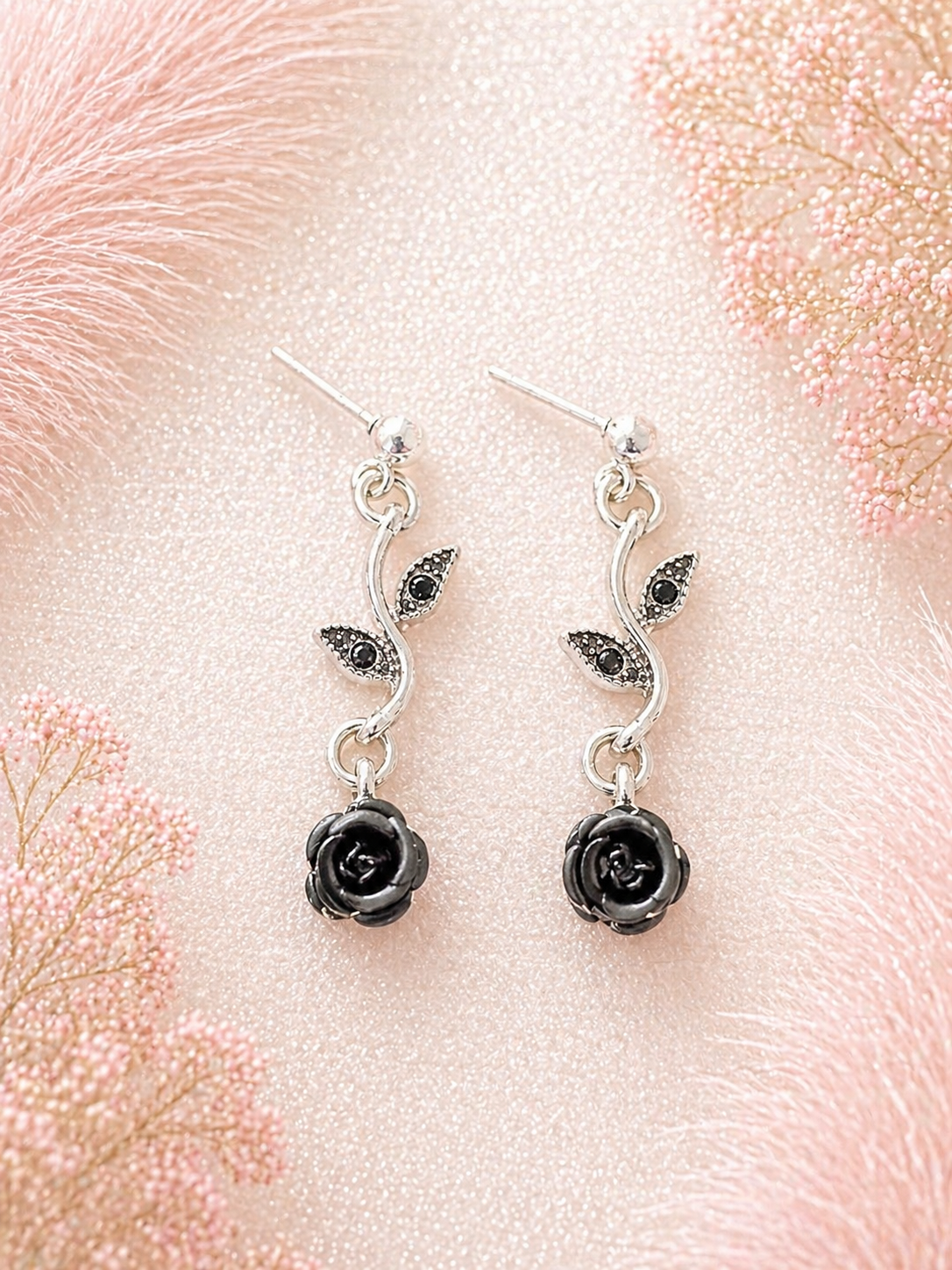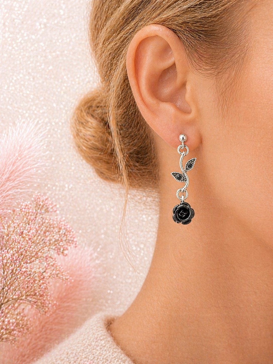Förförisk elegans möter modern design i dessa unika örhängen. Den svarta rosen symboliserar mystik och styrka, medan de silvriga detaljerna ger en lyxig och stilren kontrast. De subtila stenarna längs rankan tillför en diskret glans som fångar ljuset på ett sofistikerat sätt.
