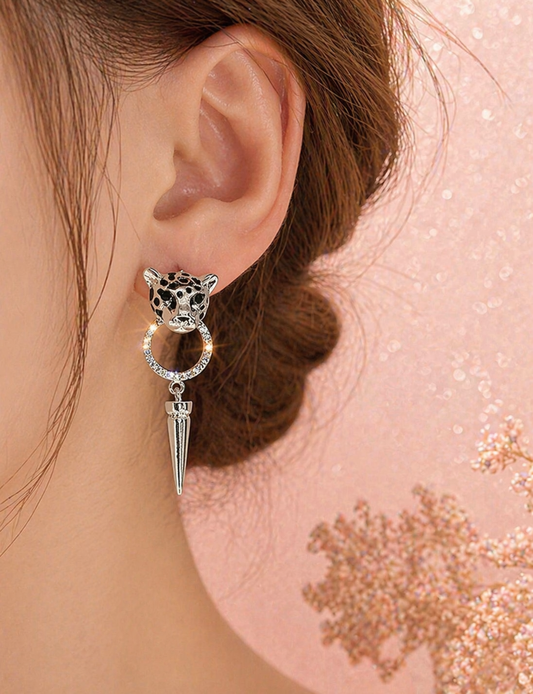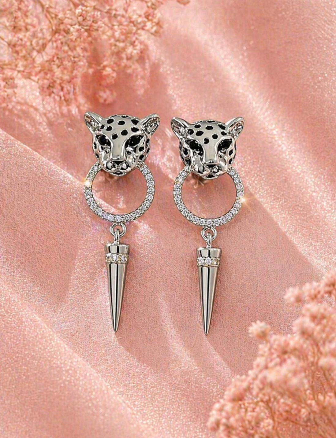 Djärva och eleganta örhängen med detaljerade panterhuvuden i silverton, kombinerade med gnistrande ringar och hängande spikar. En kraftfull design som utstrålar både attityd och lyx.