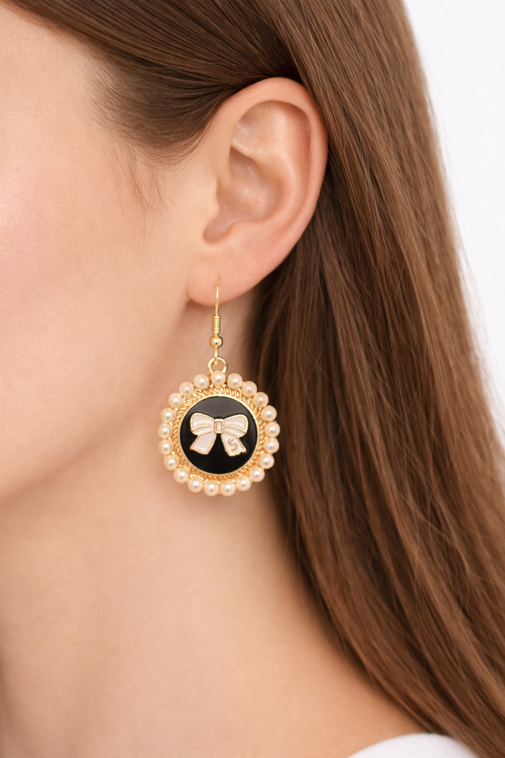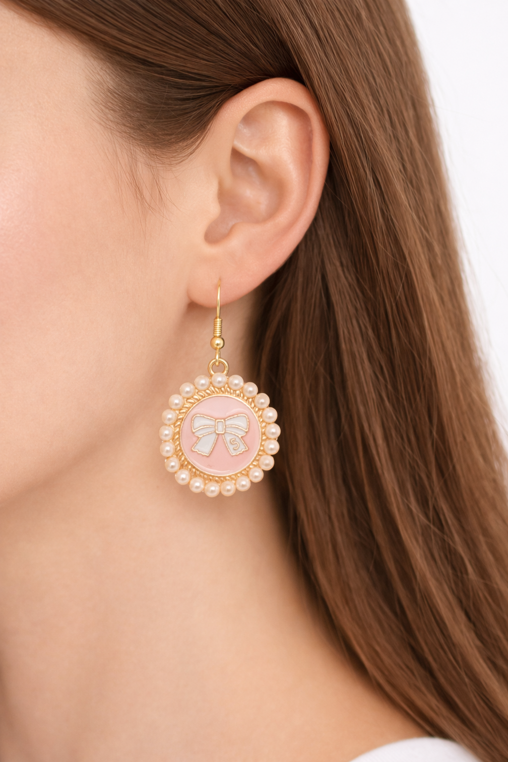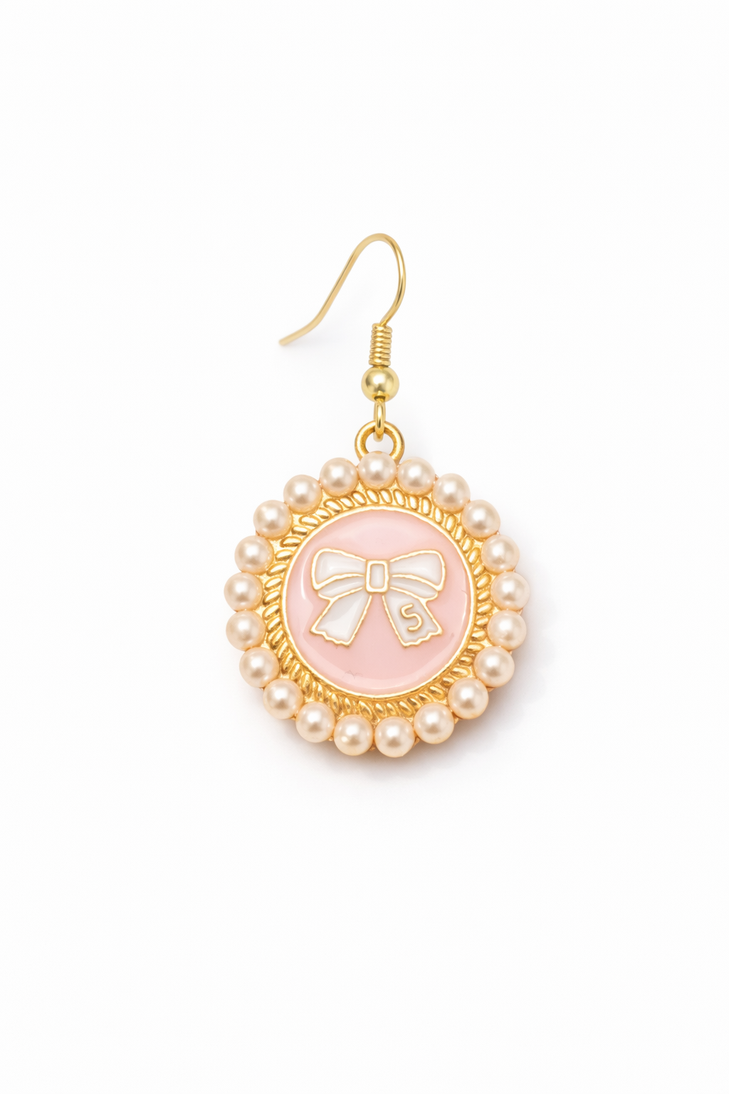Den runda formen med pärlor runt kanten skapar ett tidlöst uttryck, medan rosetten i mitten ger smycket en lekfull och sofistikerad känsla. Perfekta för dig som älskar romantiska smycken, pastelltoner och klassisk design.
