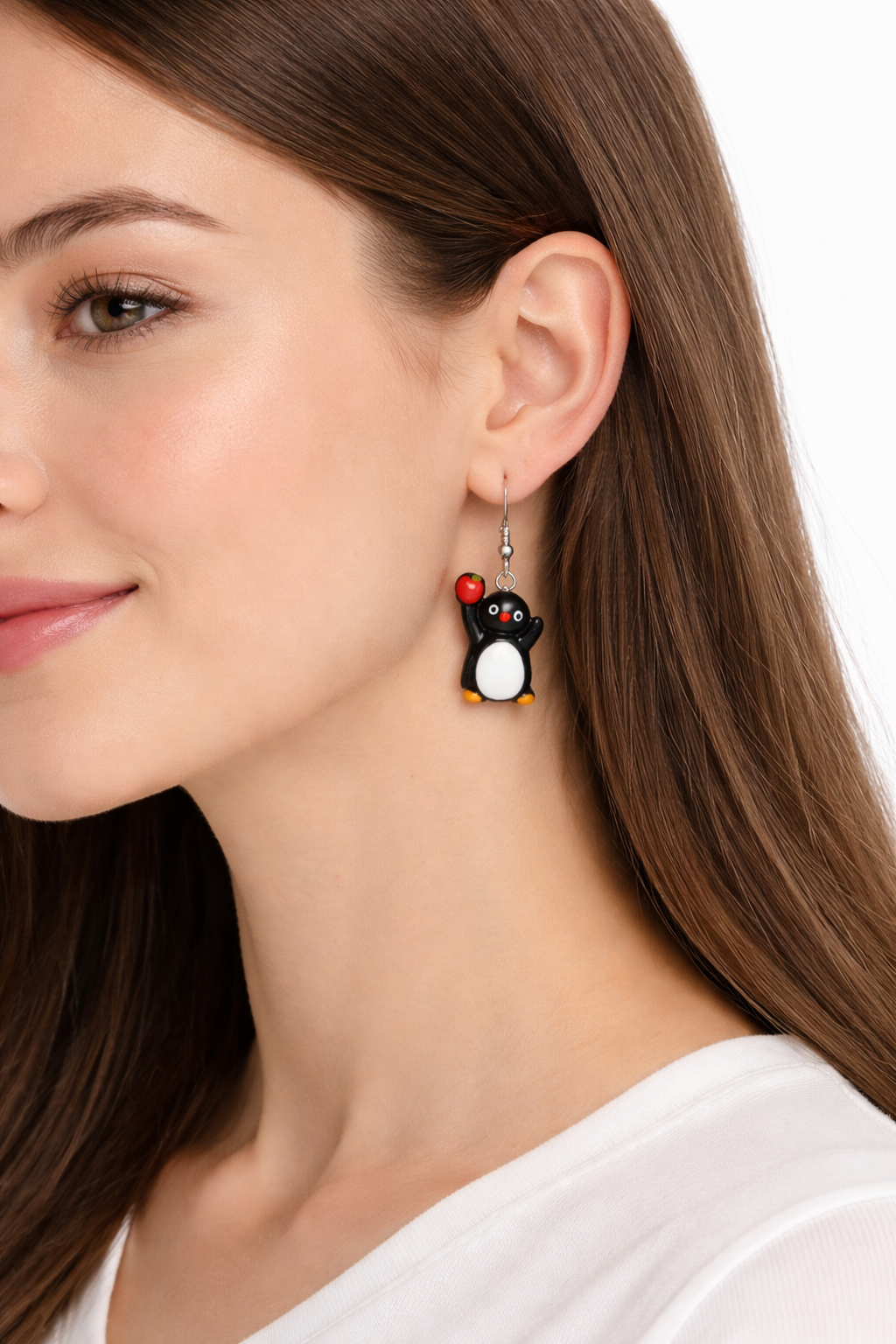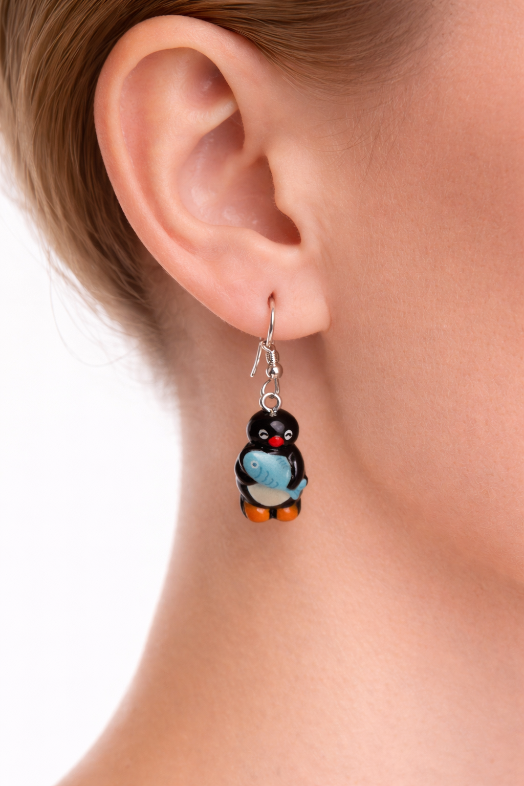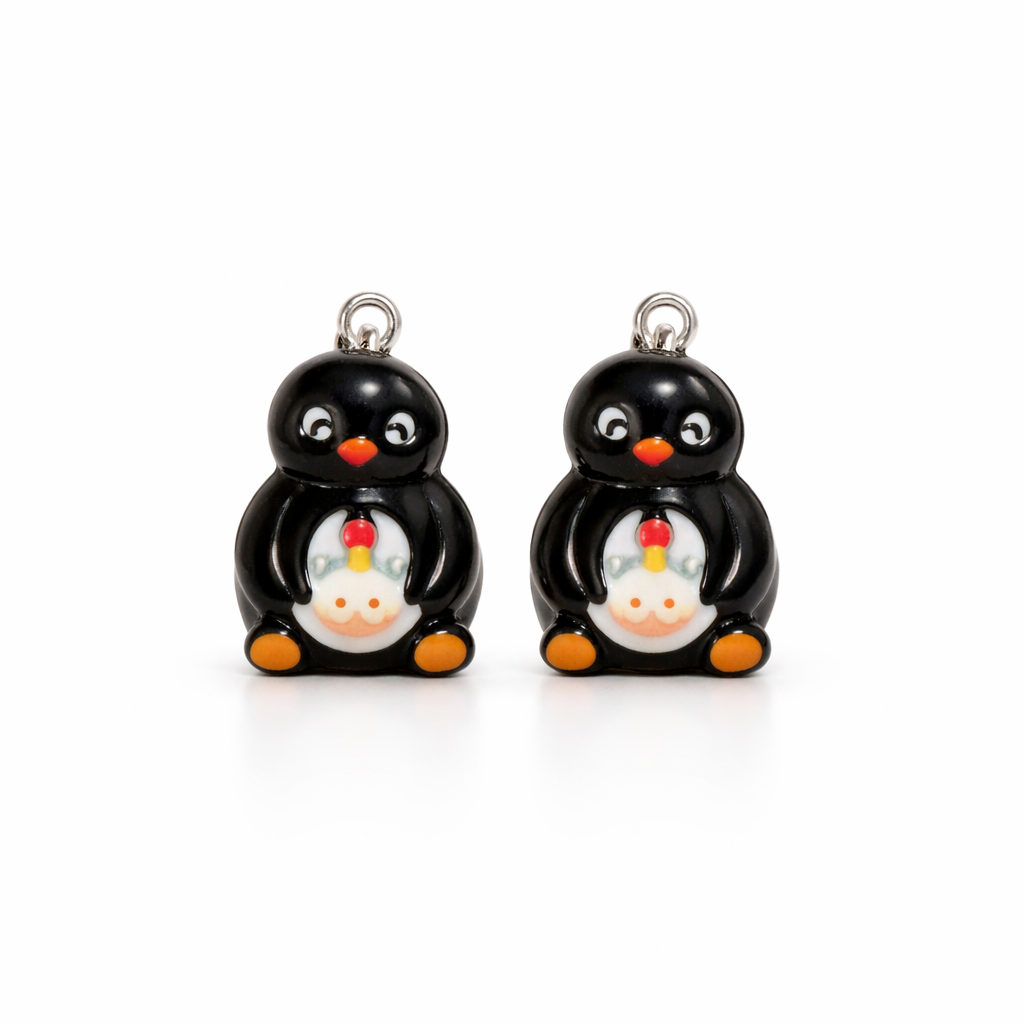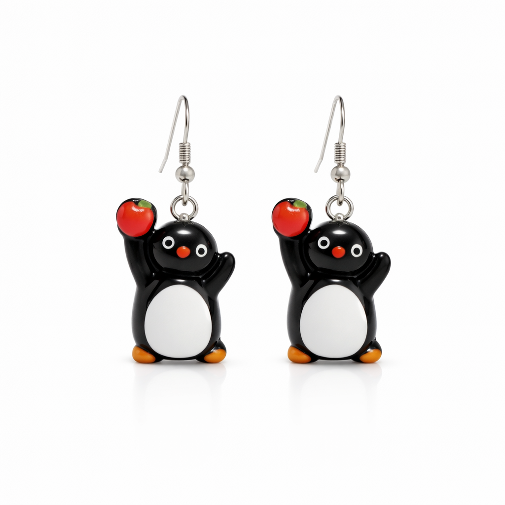 Charmiga örhängen formade som små pingviner med lekfulla detaljer. Varje pingvin har sin egen personlighet – med motiv som fisk, äpple, bok, hörlurar eller kyckling – vilket gör dessa örhängen både unika och roliga att bära.